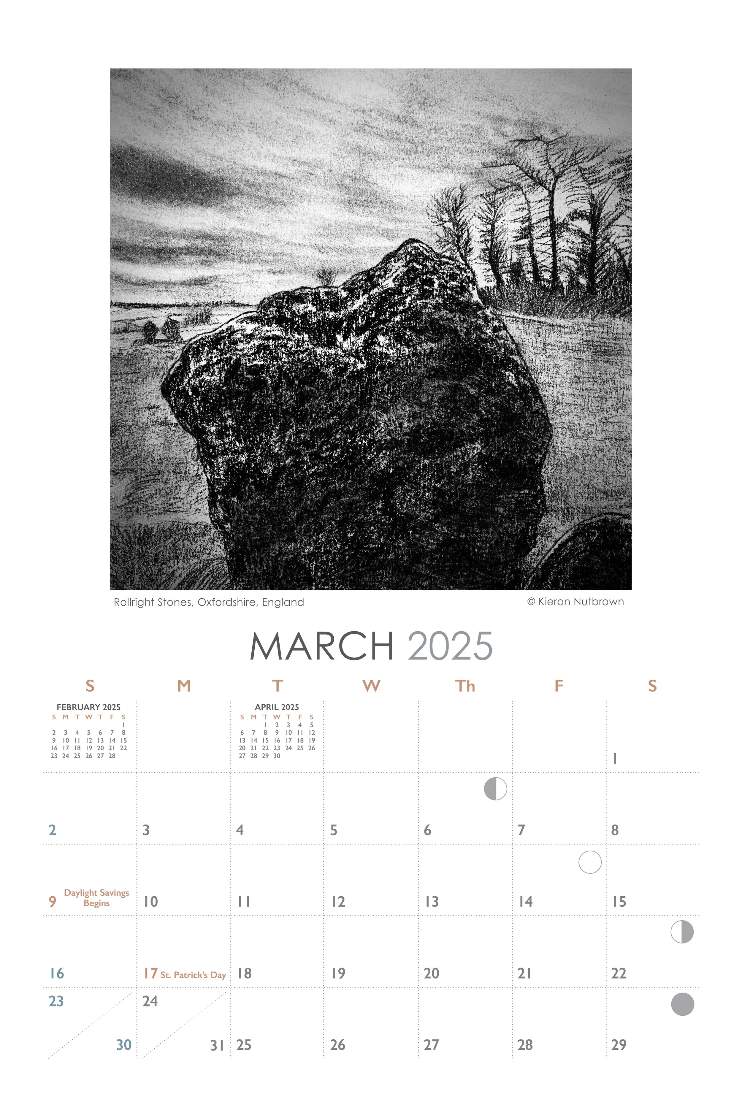The illustrations in this calendar form a collection of drawings called Stone and Sky,. a proiect inspired by journeys taken through the landscapes of the British Isles by the artist Kieron Nutbrown. These ancient megaliths were built by Neolithic peoples of those Isiands some 4000 years ago, for reasons unknown and by methods we can only surmise. As the days, months, years and millennia pass, They continue to stand as silent sentInels, timeless and unchanging under the ever-shifting skIes.