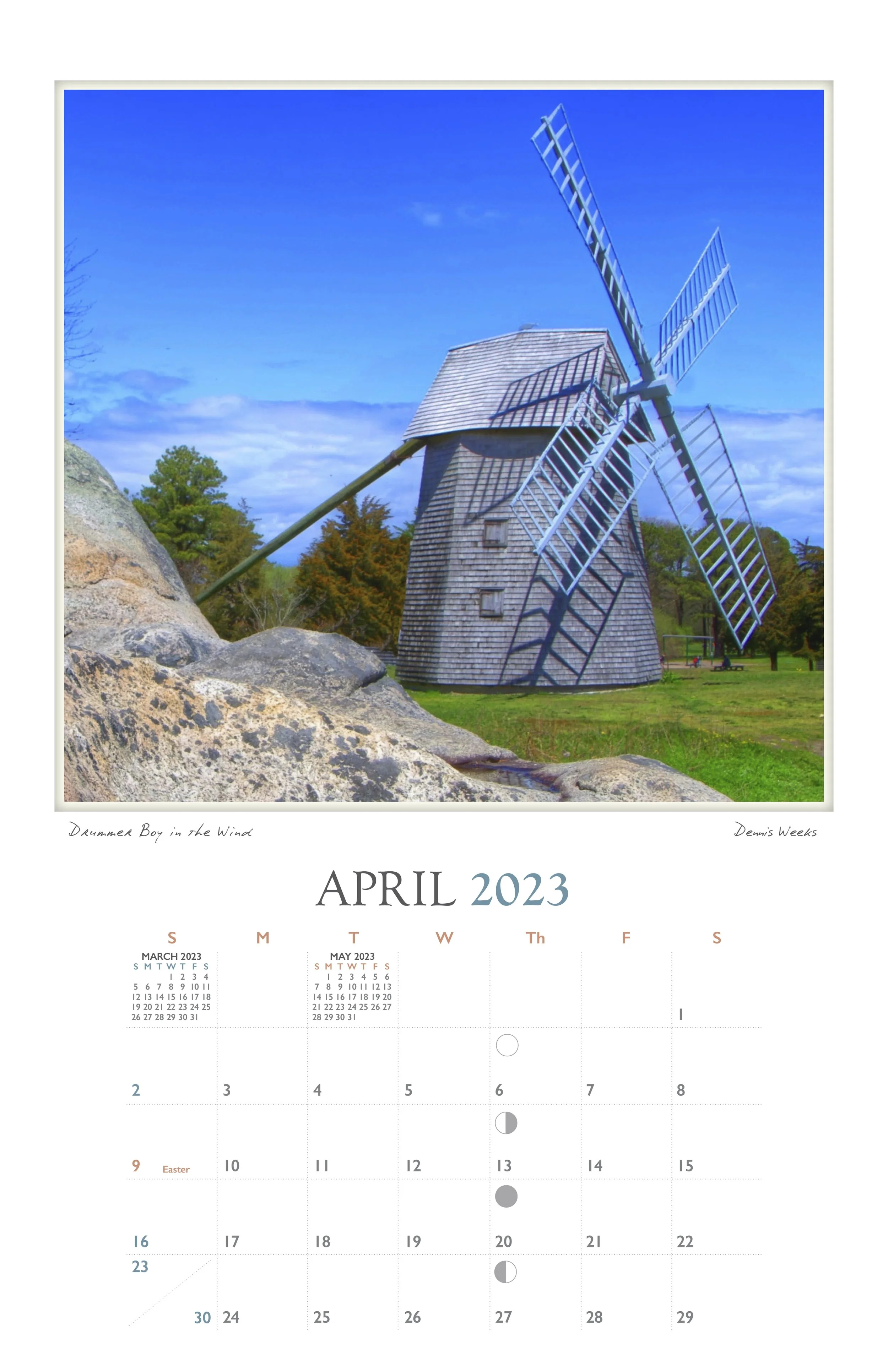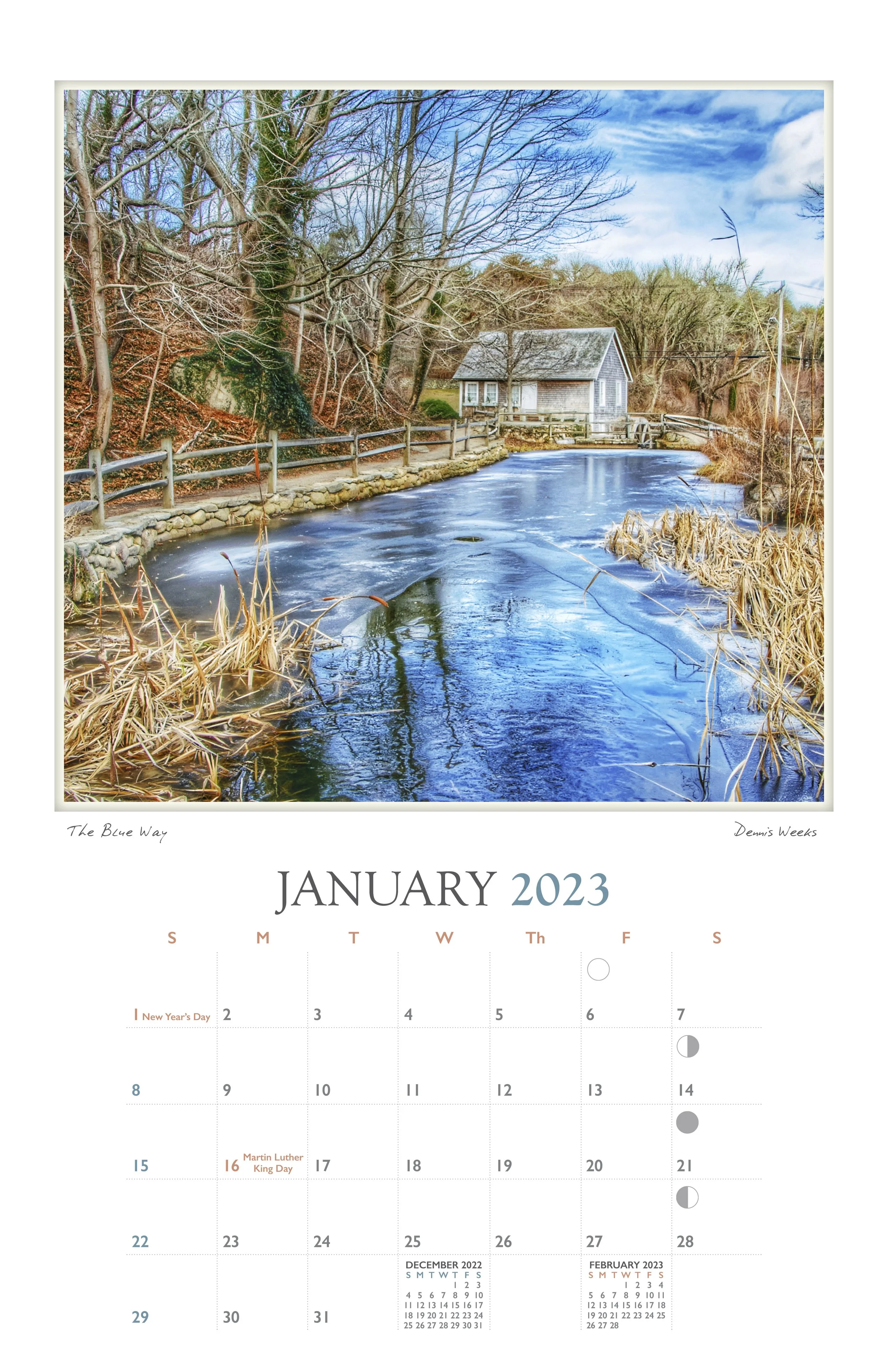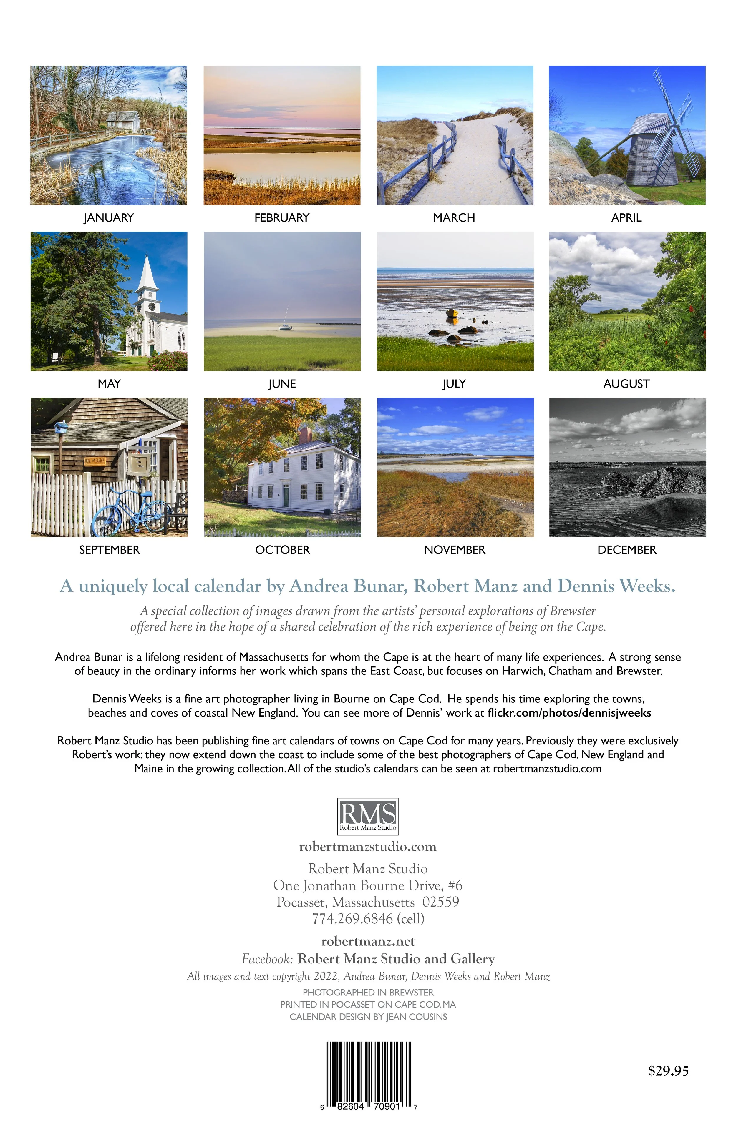 This calendar contains images of Brewster on Cape Cod by artist photographers Andrea Bunar, Dennis Weeks and Robert Manz.