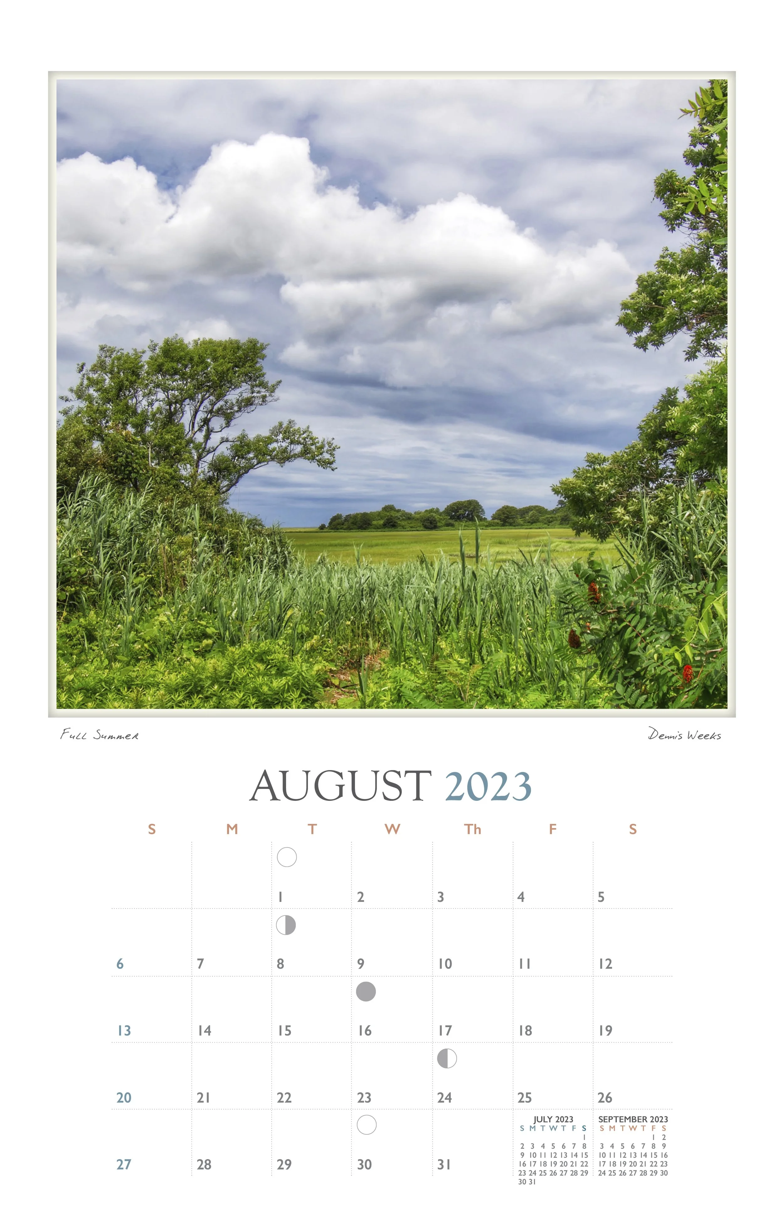 It consists of 14 sheets unbound, twelve months and front and rear cover. Each sheet is center top hole punched for easy hanging. The size given is the overall size. Roughly the top half of the sheet is dedicated to the image and the bottom half to the month days and dates grid. The calendar highlights season changes, phases of the moon and daylight savings start/finish.