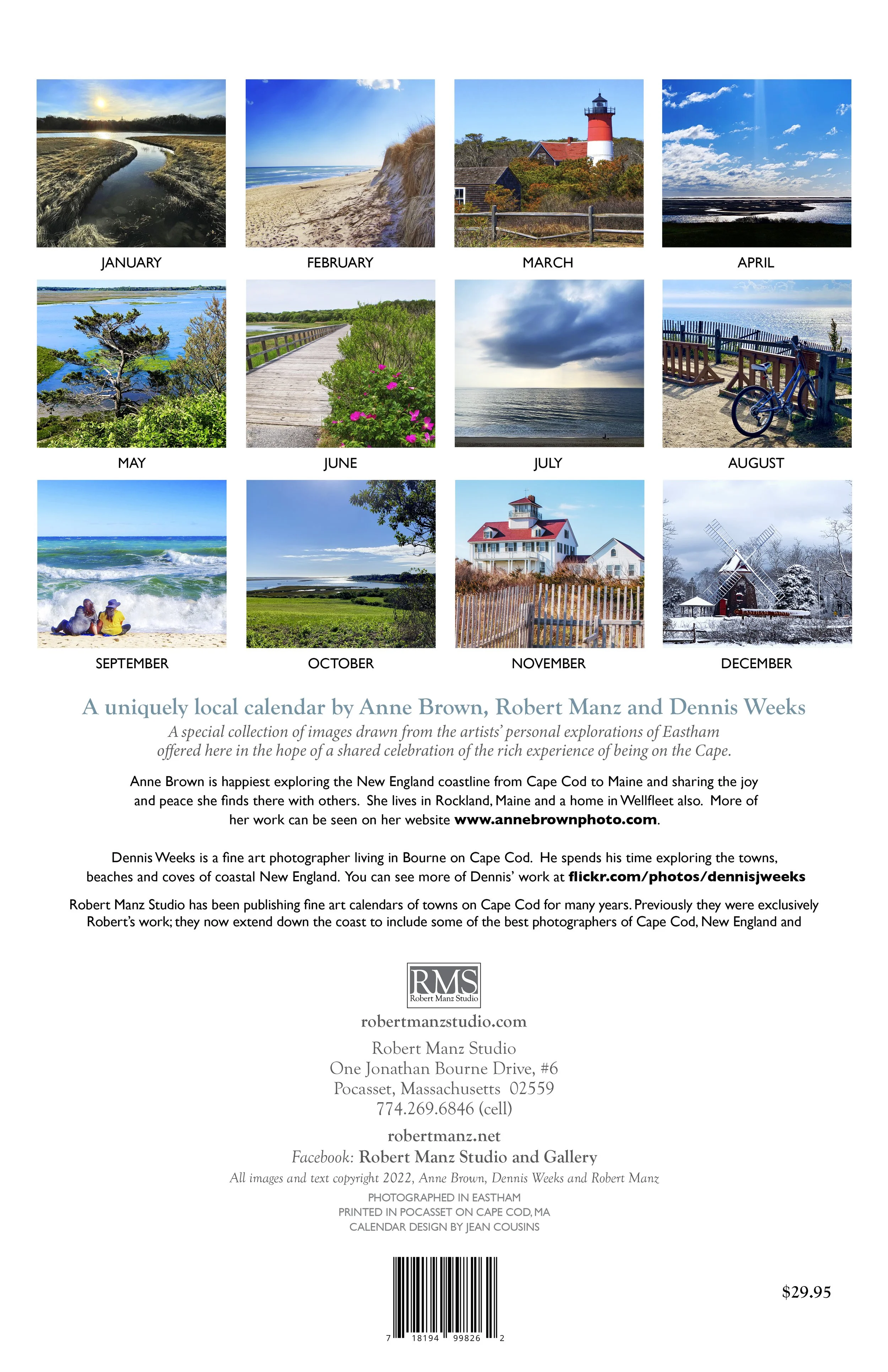 Robert Manz Studio has been publishing fine art calendars of towns on Cape Cod for many years. Previously they were exclusively Robert’s work; they now extend down the coast to include some of the best photographers of Cape Cod, New England and Maine in the growing collection. All of the studio’s calendars can be seen at robertmanzstudio.com