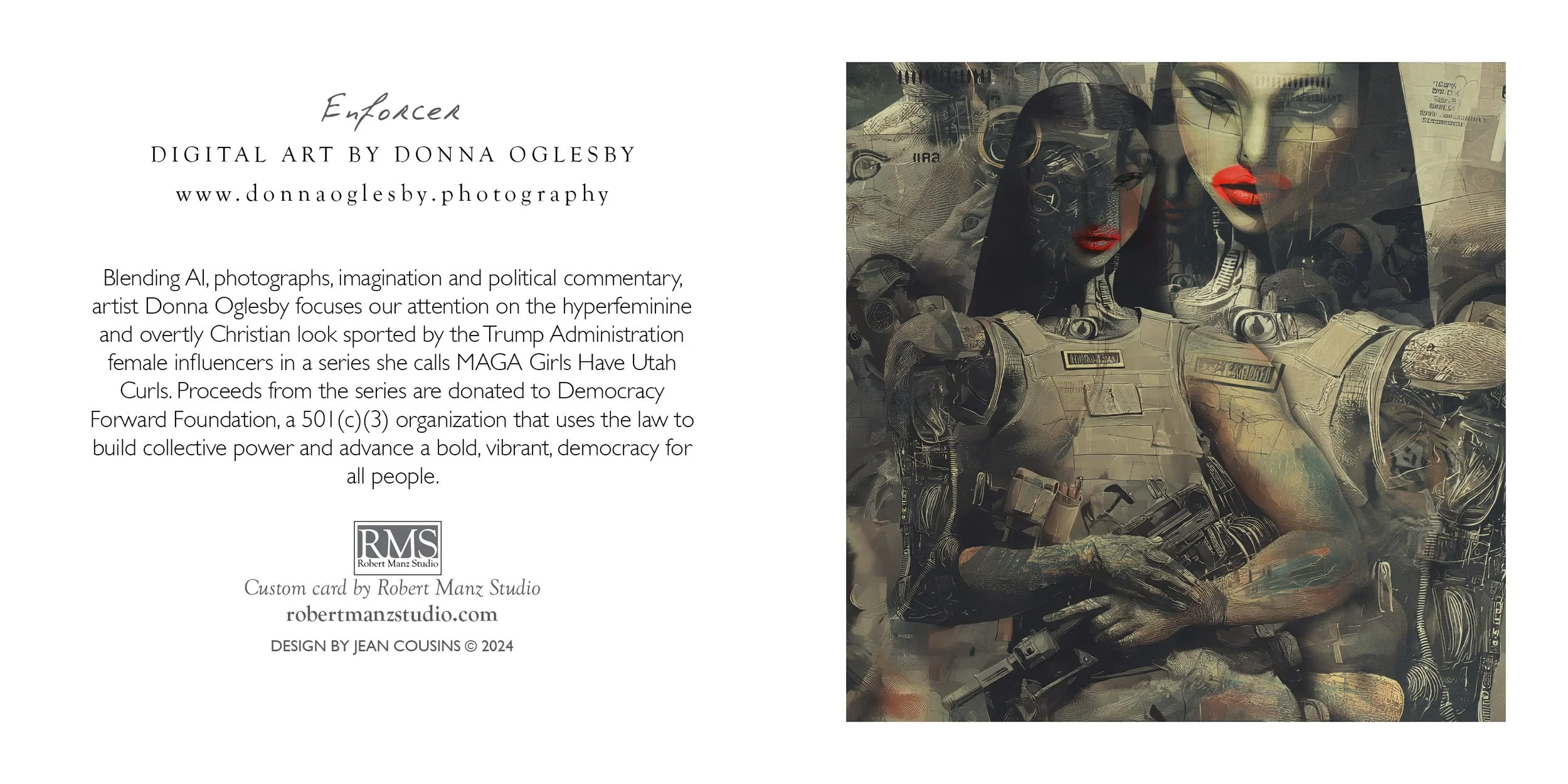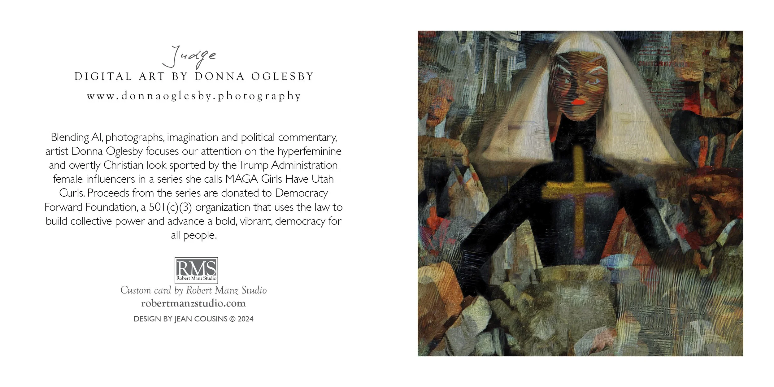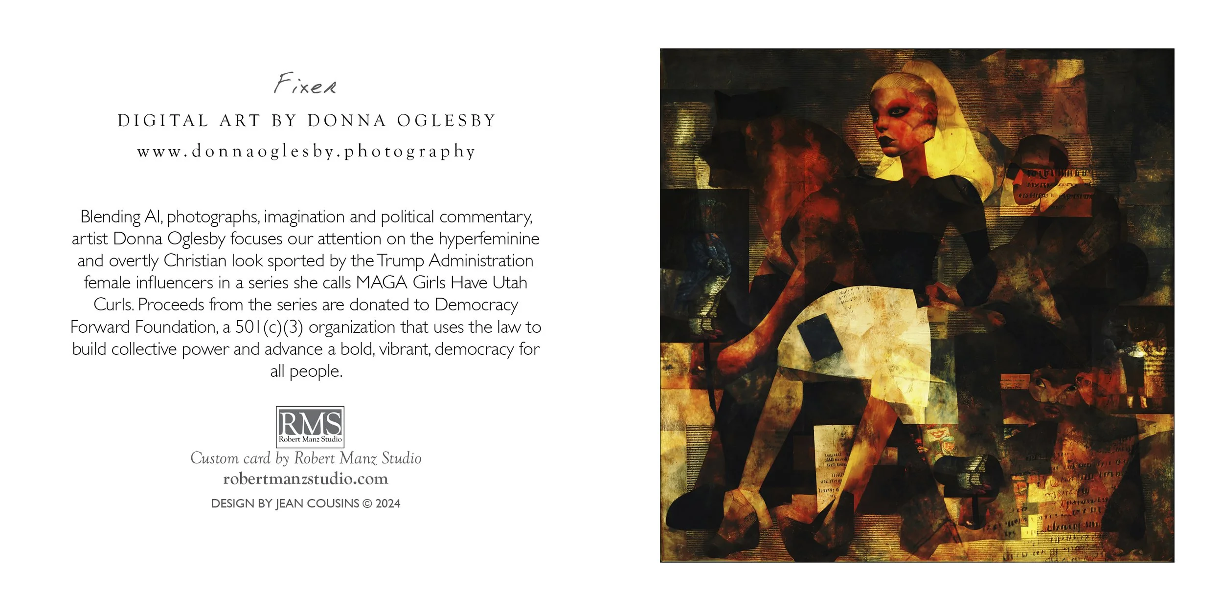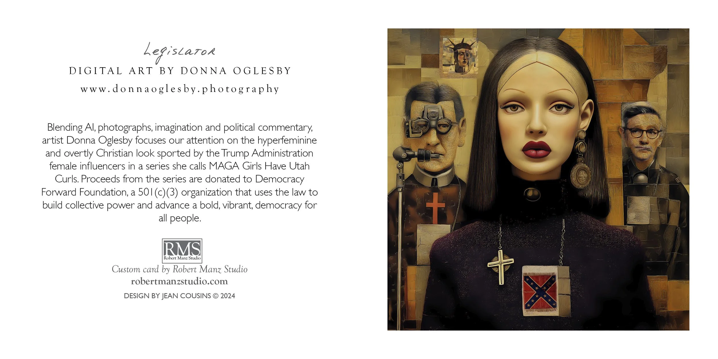 Donna Oglesby makes visual commentary about intangible ideas. Her photography is influenced by her experiences as an American diplomat in cultural landscapes across four continents. Blending AI, photographs, imagination and political commentary, this body of work bears witness to America’s contemporary political theater. All of Donna’s work can be seen on her website, donnaoglesby.photography