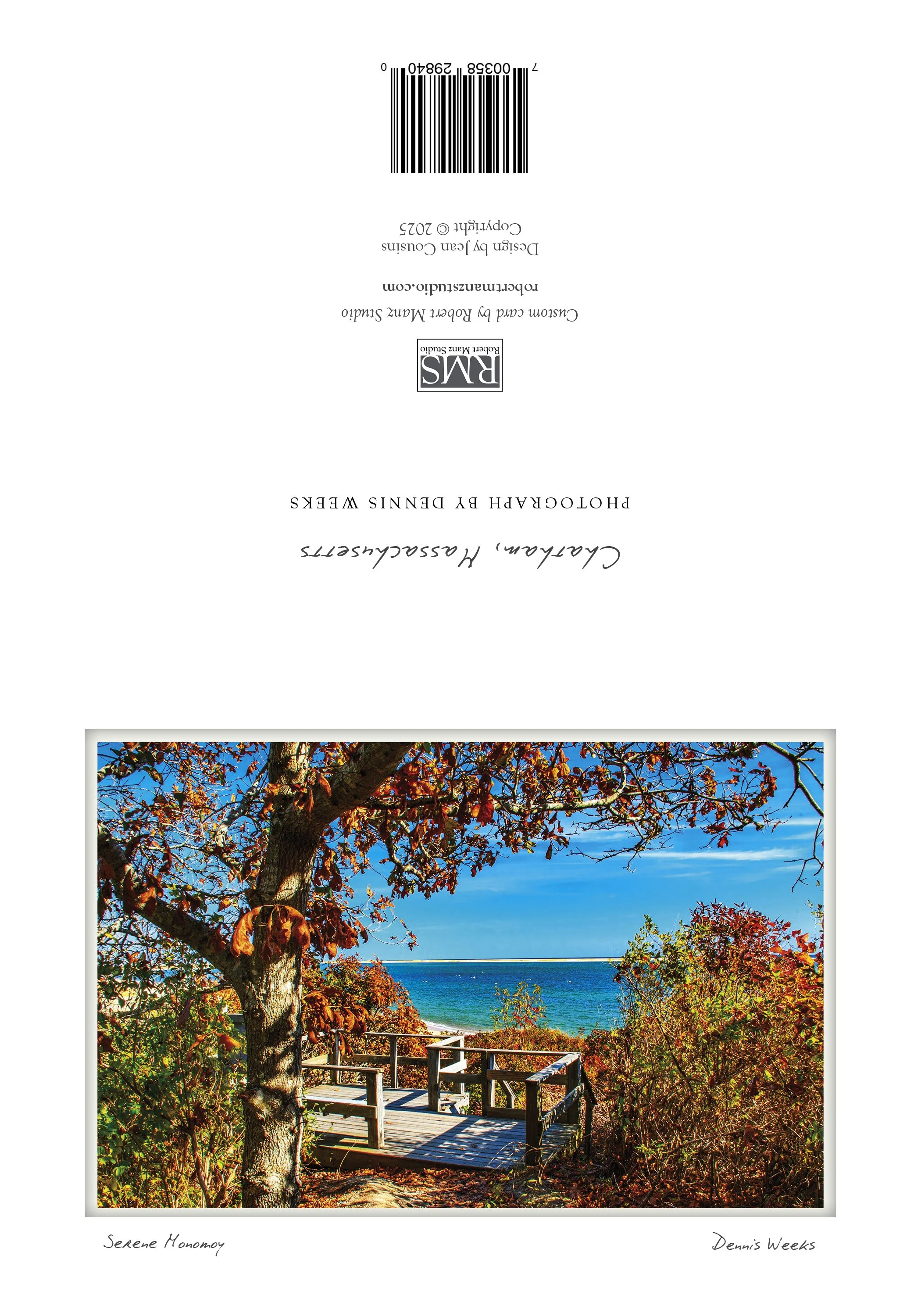 Note cards are printed personally in Robert Manz Studio, folded, inserted in a clear plastic sleeve, along with a quality cream-colored envelope. The card is blank inside, is digitally signed by the artist beneath the image, and has the location information printed on the back.